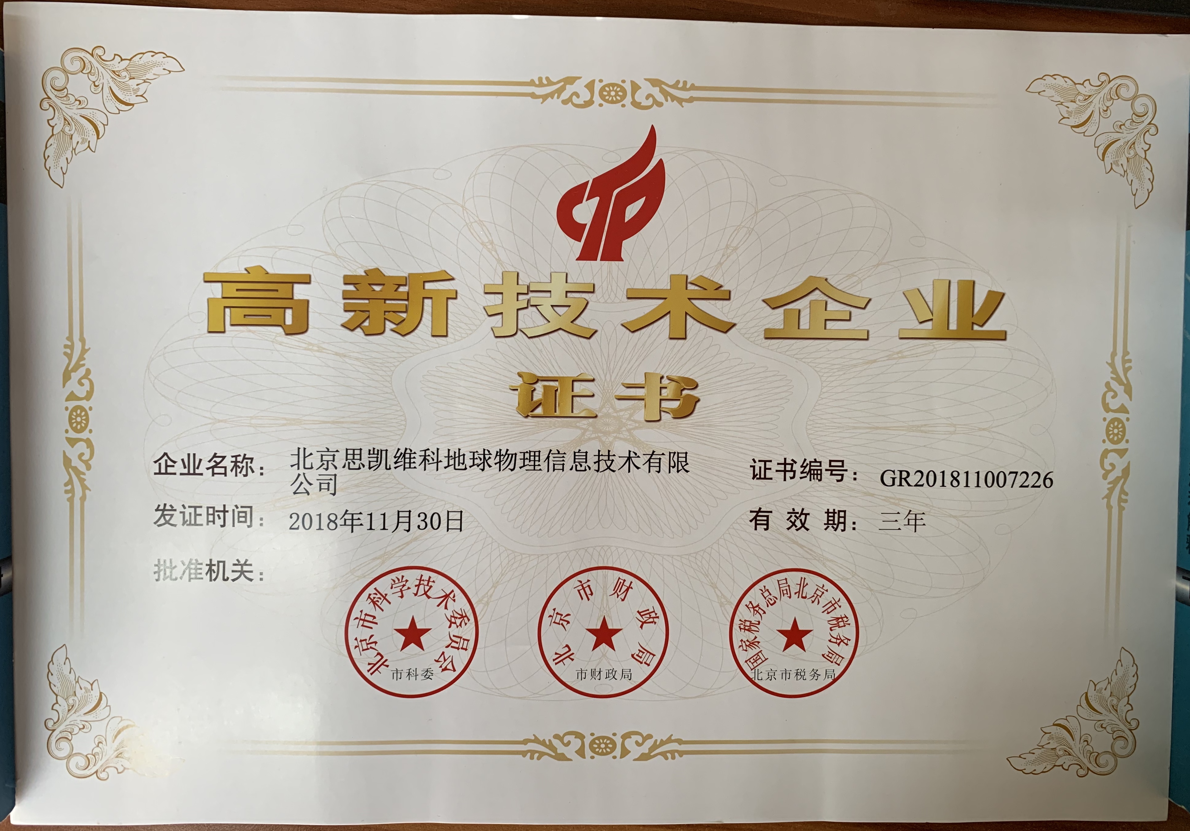 近日,北京思凯维科地球物理信息技术有限公司被授予“高新技术企业”荣誉证书,大大提高了我公司参与各项招投标业务的竞争力,同时也进一步提升了我公司的企业品牌形象,进而促进企业科技转型。