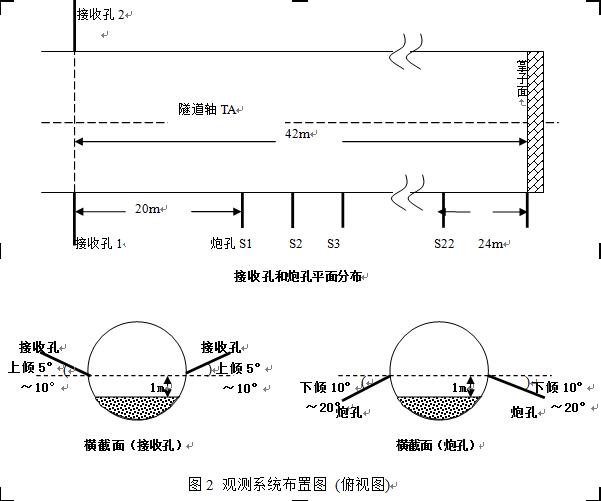 布置:垂直隧道轴向,向下倾斜10°~20°(激发时密封炮孔)。