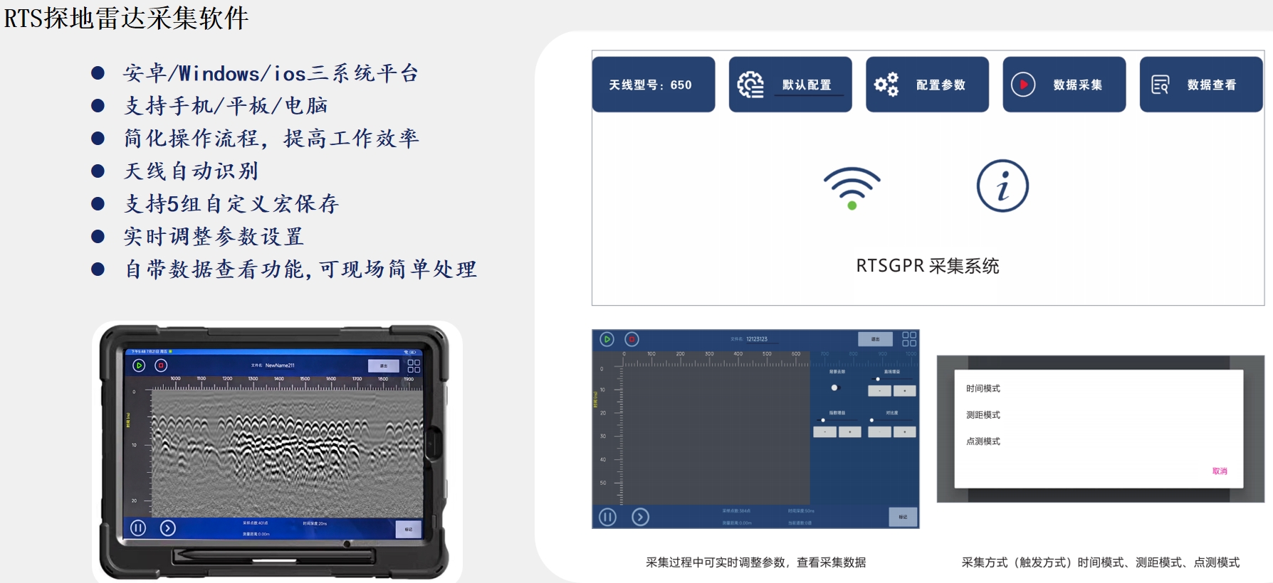 RTS系列无线探地雷达是基于实时采样、高叠加技术的无线探地雷达,实时采样技术具有高采样率、高叠加、宽动态等特点。