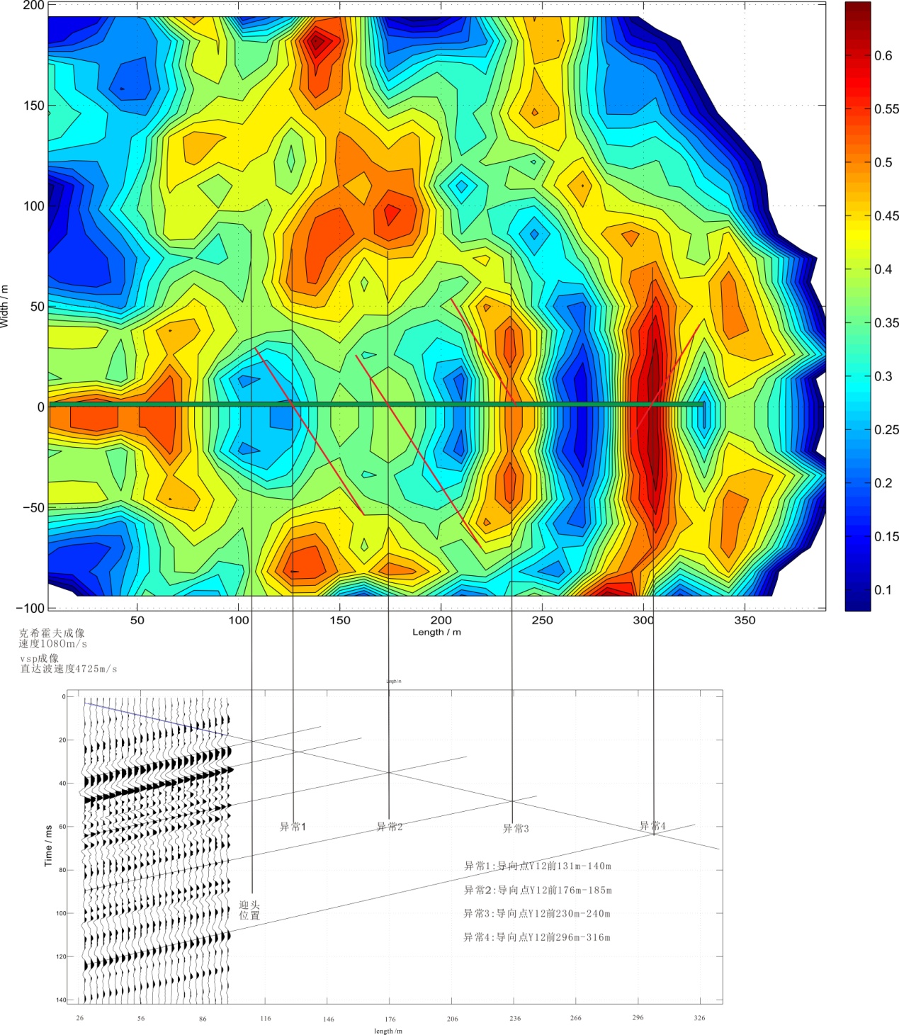 从虚震源结果看,其异常与巷道轴向相交位置与拟VSP结果近似,其异常带走向与克希霍夫偏移成像中切线方向近似。