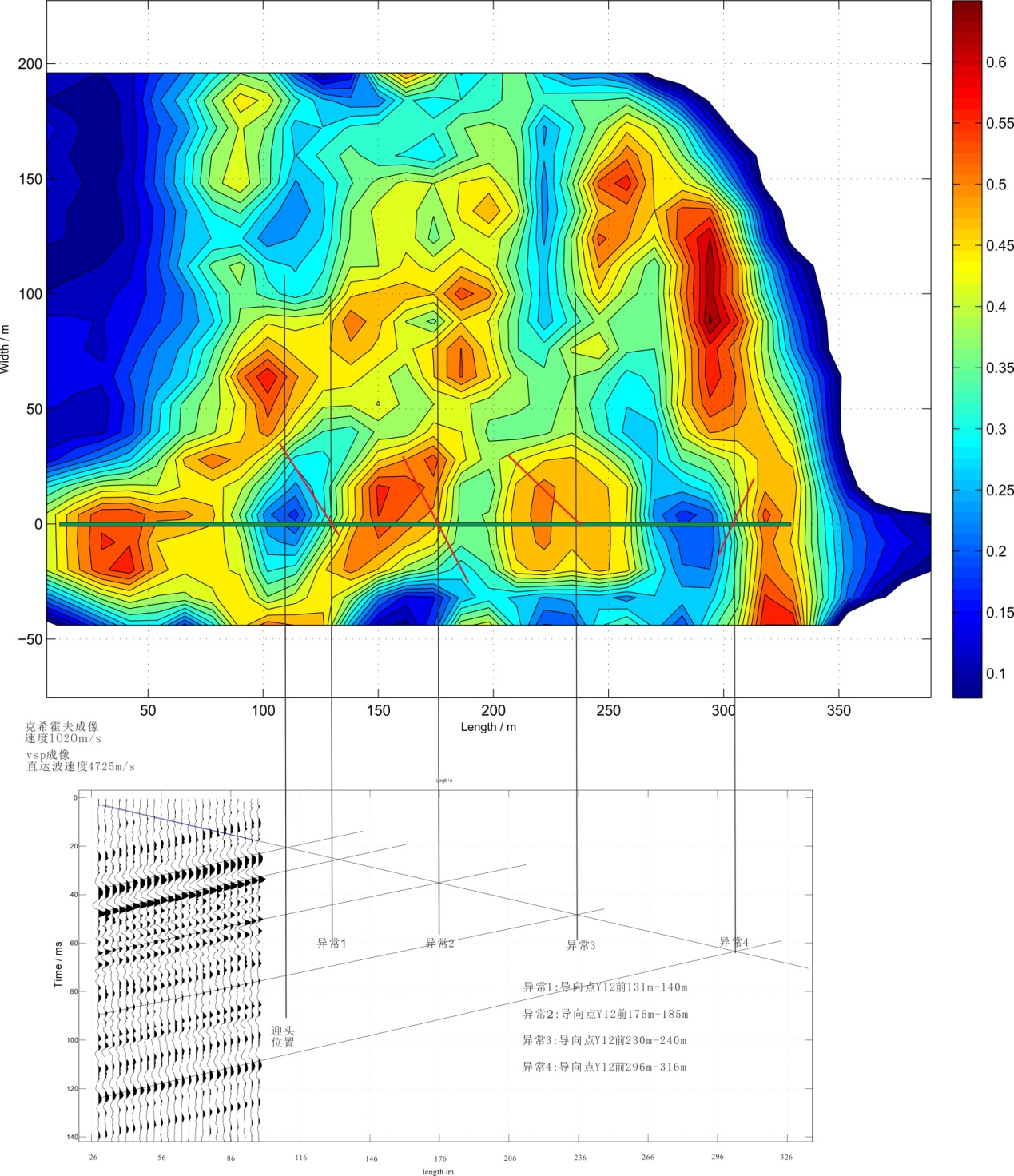 拟VSP法结果显示,导向点Y12前方坐标109.7m-330m范围内存在4个(组)反射界面,对应的反射波同相轴清晰可见,反射波同相轴连线与直达P波同相轴连线交点的横坐标即为构造面与巷道轴线相交的位置。