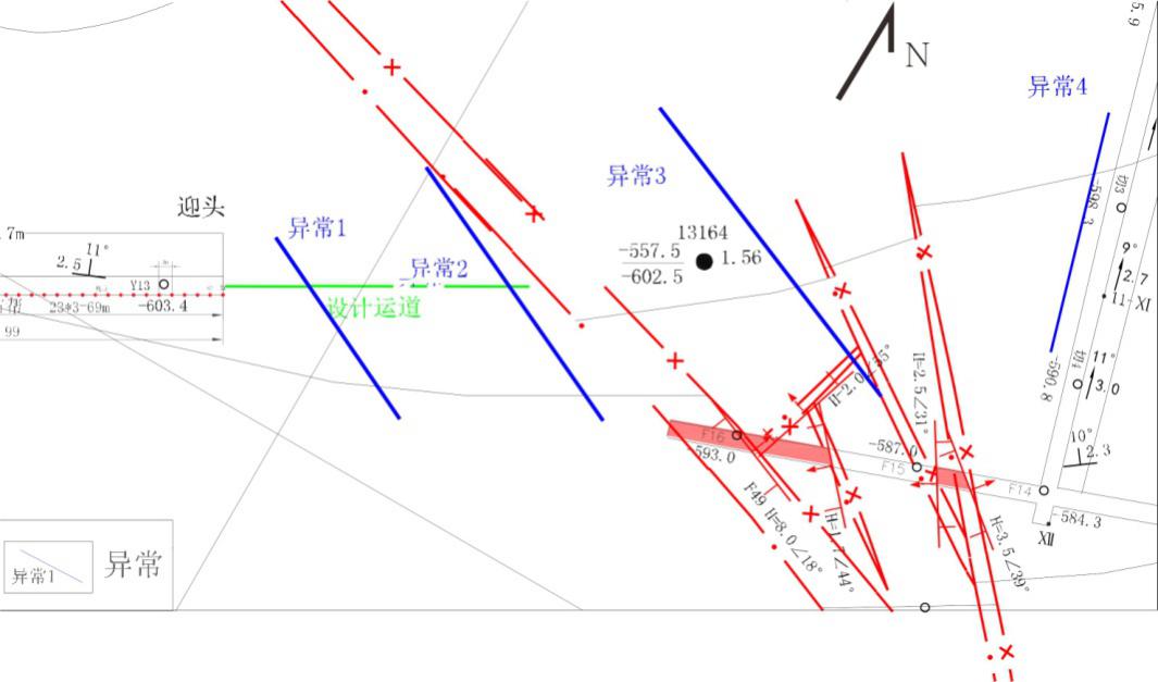综合解释成果图显示,导向点Y12前方坐标109.7m-360m范围内存在4处地质构造异常区,由近及远分别标记为1-4号异常。将异常体与钻探及已知巷道进行对比分析(图5-43)1号异常位于导向点Y12前方坐标131m-140m处,分析认为煤岩层裂隙发育的综合反映,钻探结果未验证;2号异常位于导向点Y12前方坐标176m-185m处,分析认为煤岩层断层的反映,与已知断层F49位置一致,钻探验证,误差小于5m;3号异常位于导向点Y12前方坐标230m-240m处,分析认为煤岩层断层的反映,钻探验证,误差小于8m;4号异常位于导向点Y12前方坐标296m-316m处,与已知巷道位置相近,解释为巷道异常,误差小于10m。