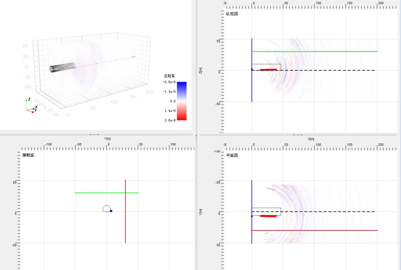 该隧道位于德昌县六所乡境内,全长520米,为单洞双线设计,洞身主要通过花岗岩,花岗岩风化程度为V级,最大埋深约80米,围岩级别较弱,地形起伏较大,施工难度大,安全风险高,是项目重点控制性工程。数据处理结果如下图: